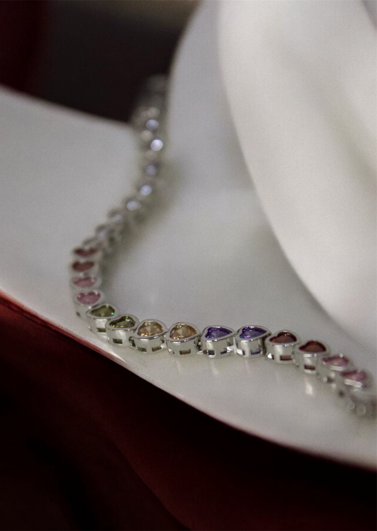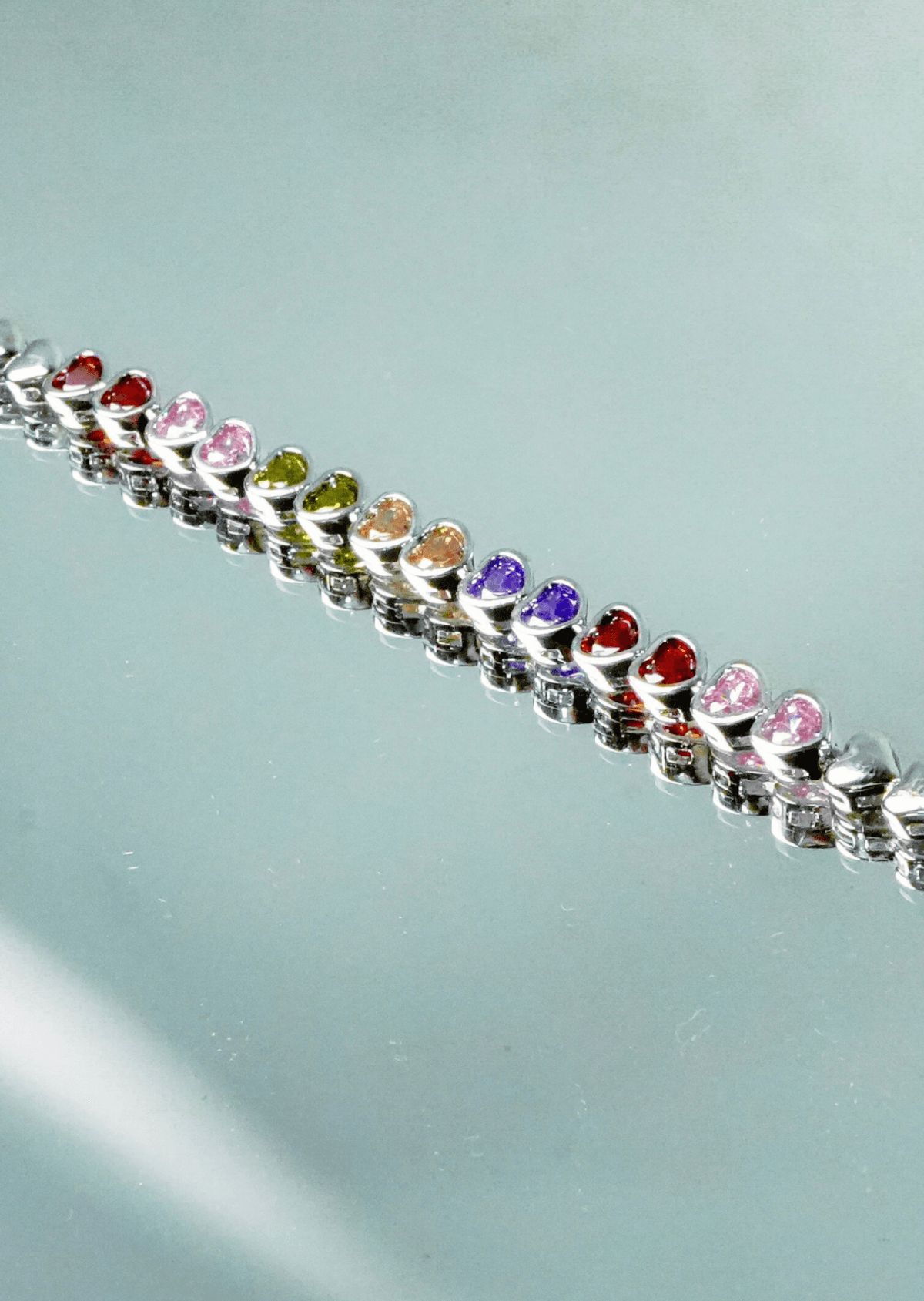 Crafted from 92.5 sterling silver, the Heart of Luxe Bracelet showcases vibrant, colorful hearts with a polished, high-quality finish. Designed to be anti-tarnish, waterproof, and hypoallergenic, it ensures lasting beauty and comfort.