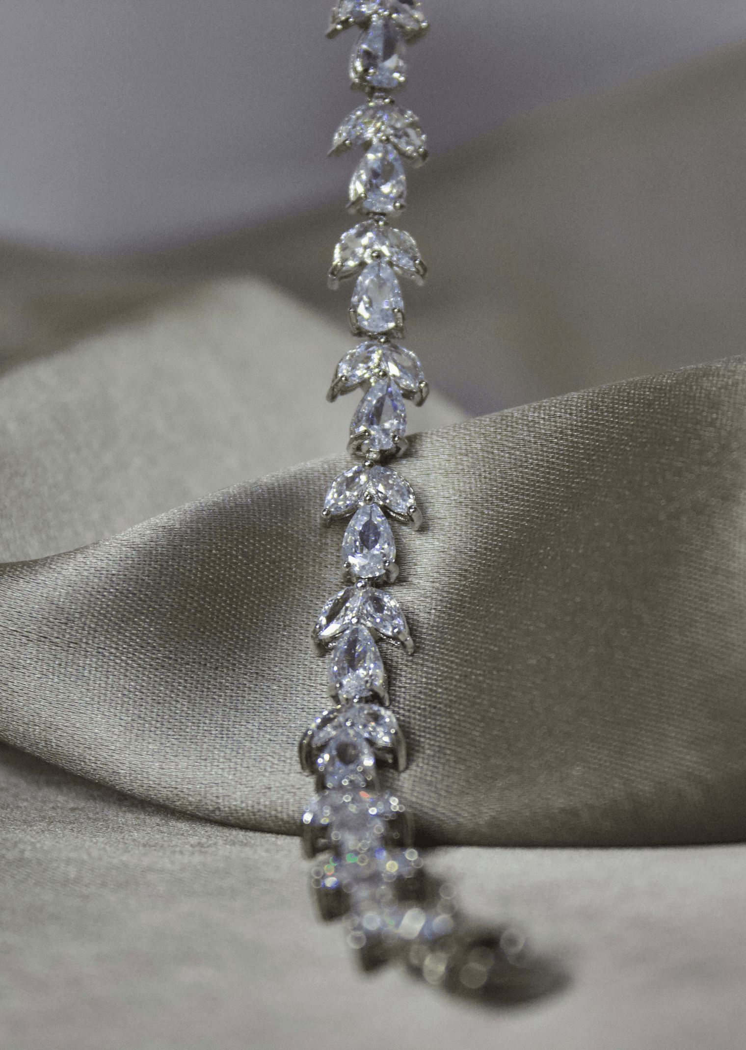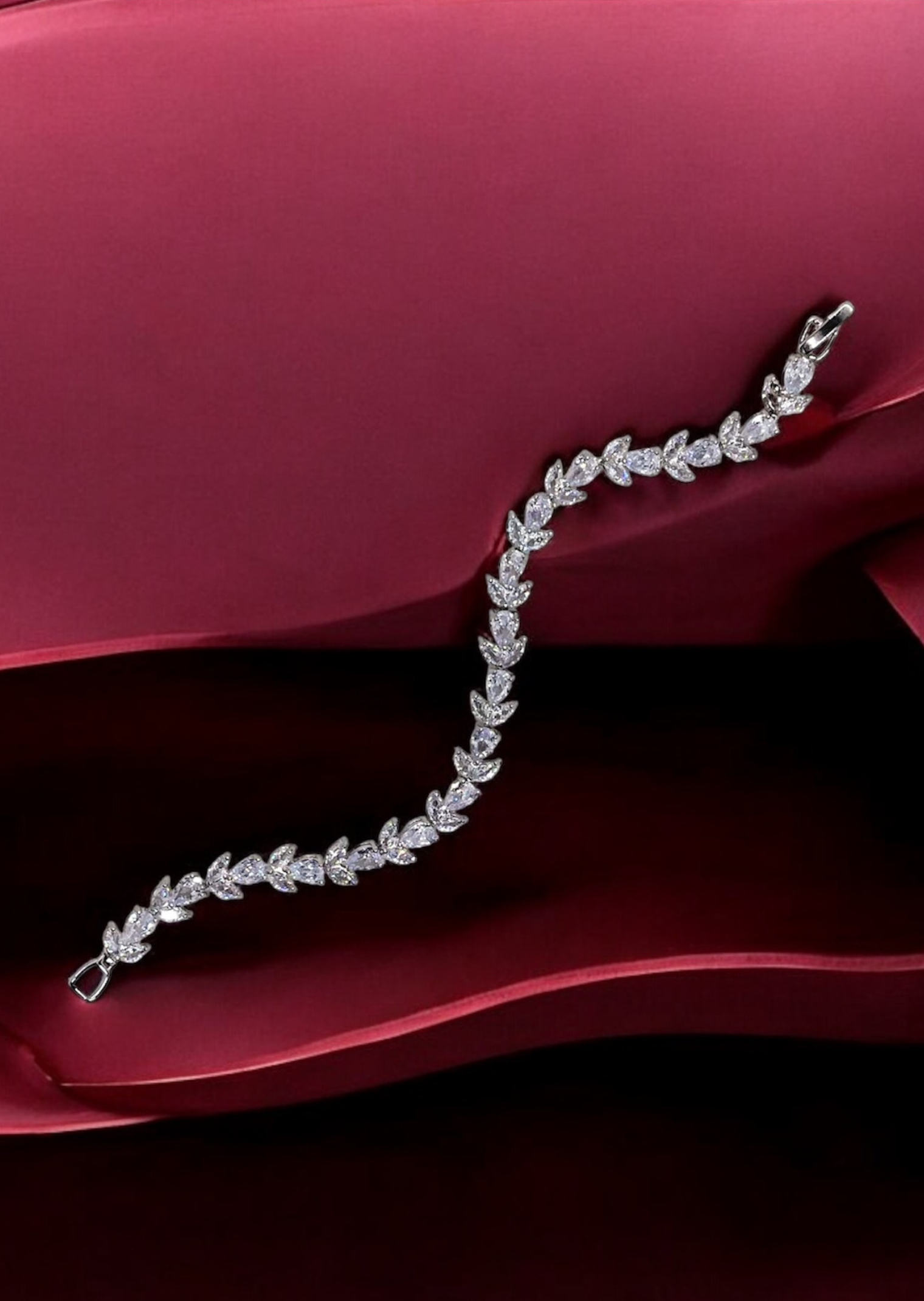 The Sparkling Leaf Bracelet, made from 92.5 sterling silver, exudes elegance with its shimmering leaf-shaped crystals. Its delicate design makes it perfect for any occasion, from casual wear to formal events.
