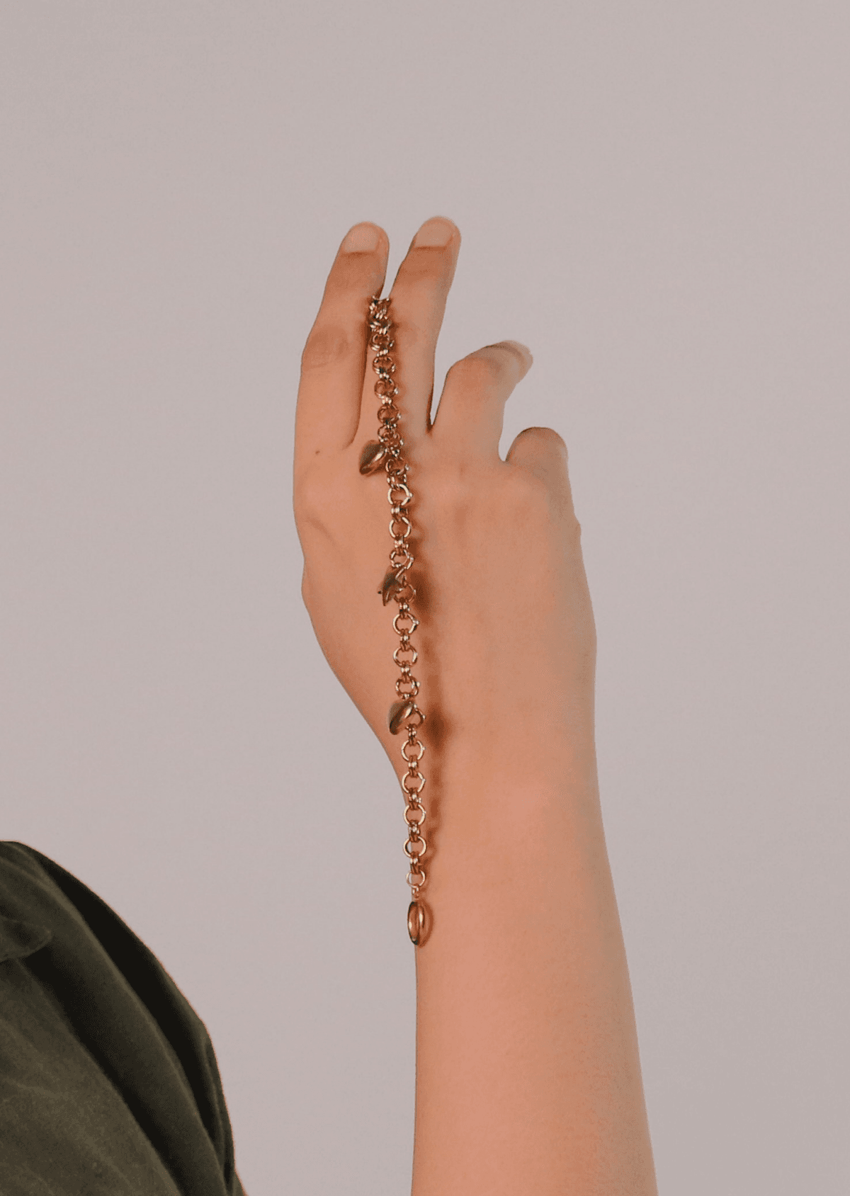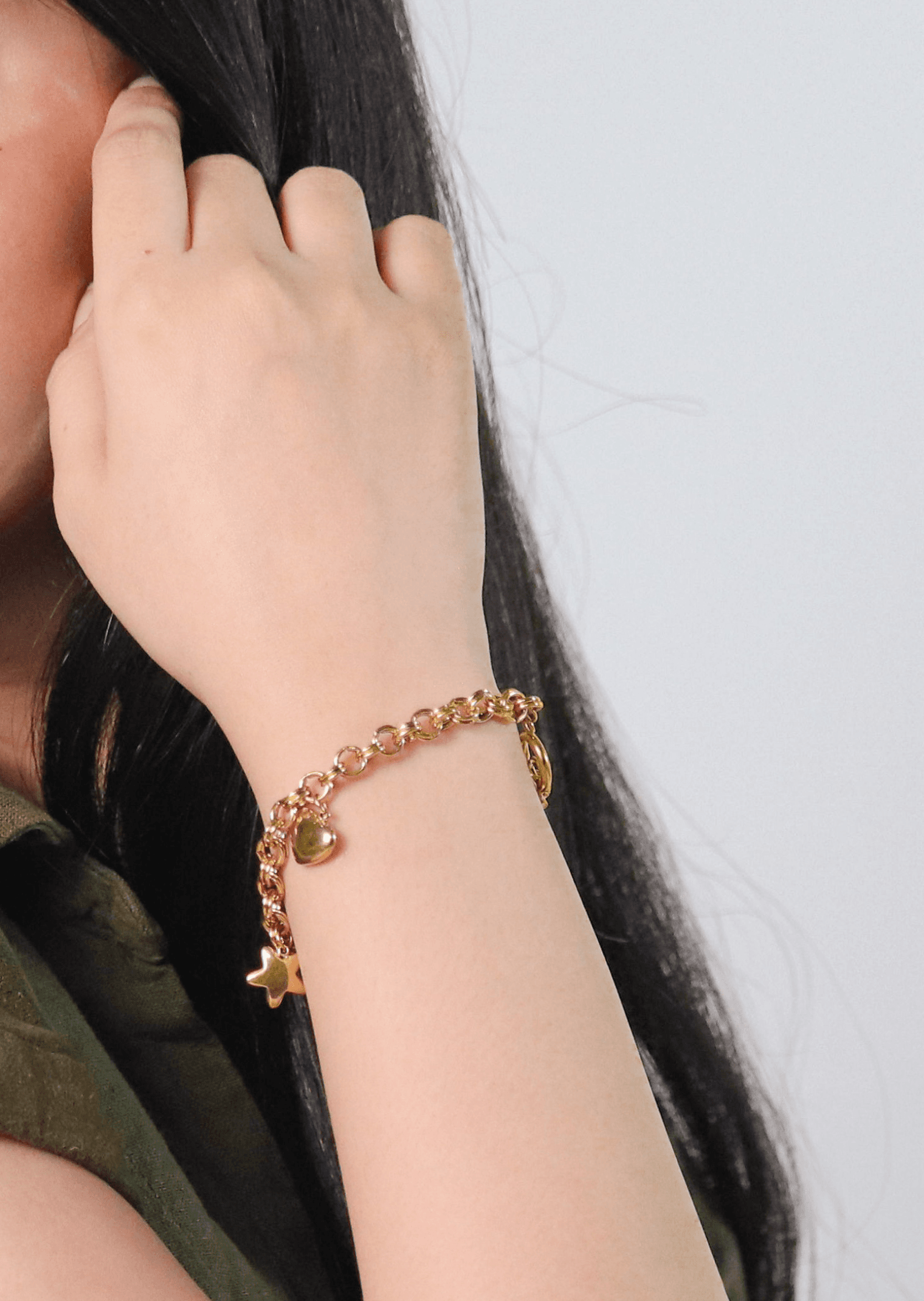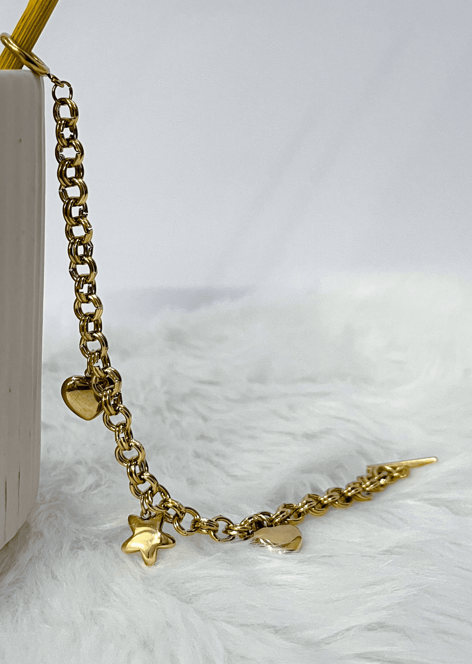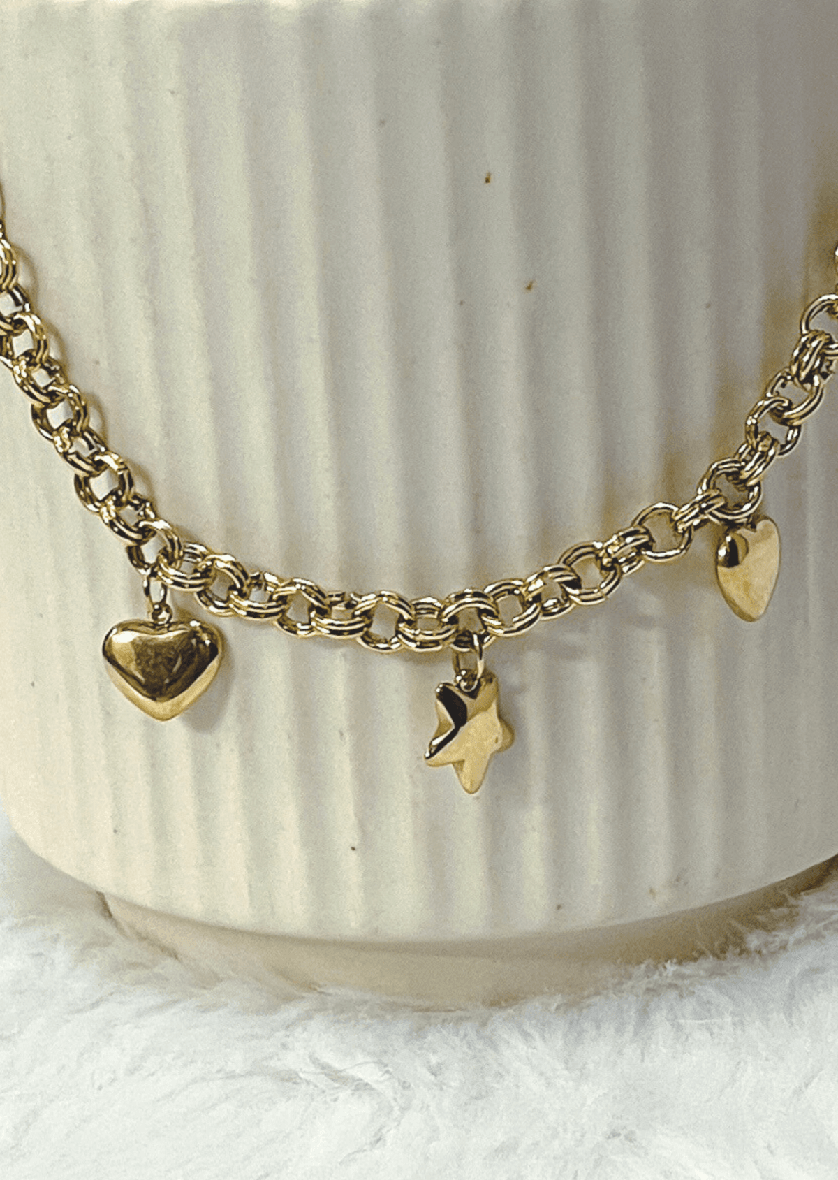 The Starry Hearts Bracelet, crafted with charm and elegance, features a striking star in the center and two dainty hearts on either side, creating a playful yet refined accessory.