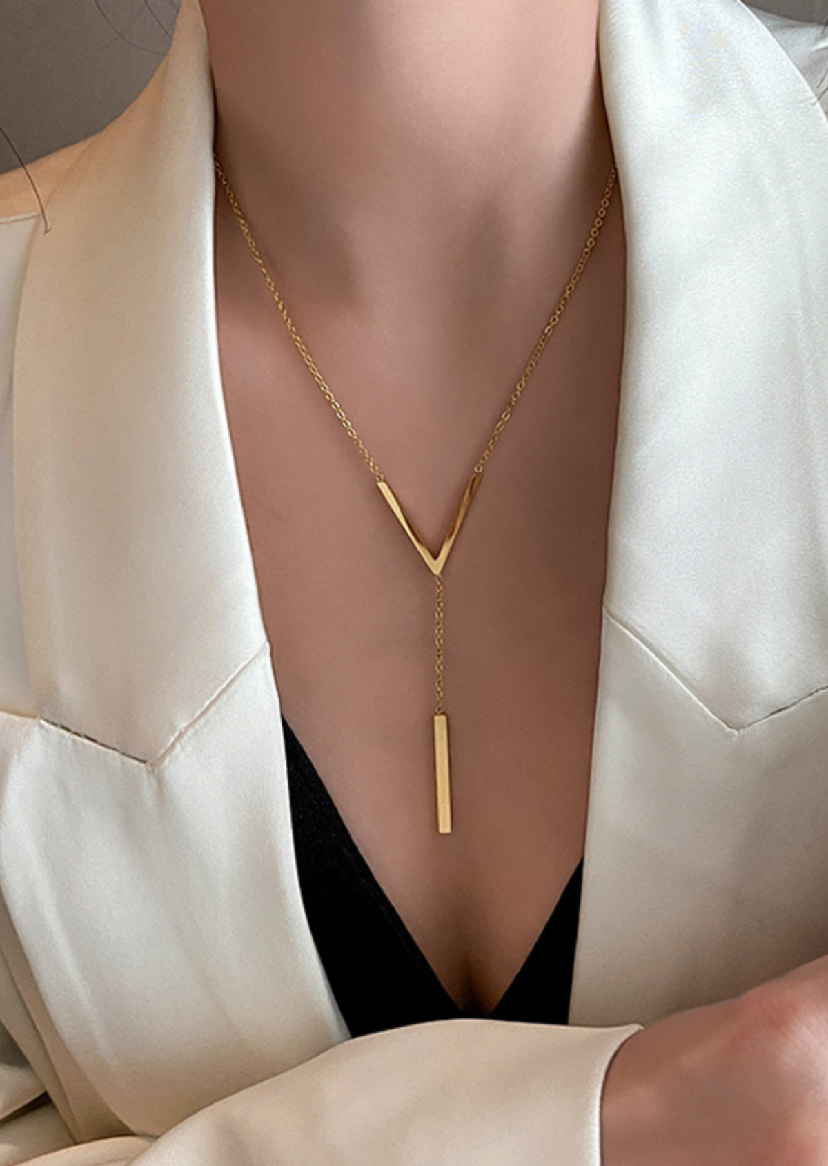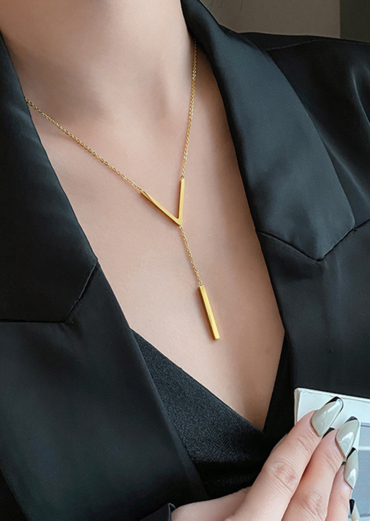Introducing the V Line Necklace—a sleek and stylish statement piece that adds the perfect touch of elegance to any outfit. With its minimalist V-shaped design, it’s your go-to accessory for both casual and dressy looks, elevating your style effortlessly.